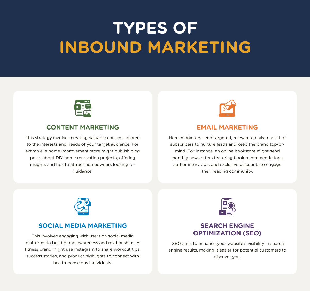 Content-Driven: Quality content is the foundation of inbound marketing. This can include blog posts, e-books, webinars, videos, infographics, and social media posts, all optimised to provide information and value to a specific target audience.